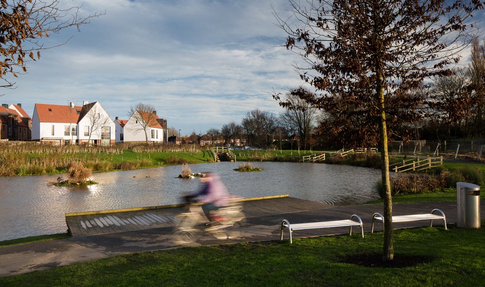 Walking around the finished part of the development it’s easy to see that these homes make an interesting place to live. Full height windows, high ceilings, wide sweeping tree lined roads all give the impression of a carefully considered environment. Of course that’s what the Joseph Rowntree Housing Trust is about. You can often find them being interviewed in many aspects of homes from things such as price and availability to quality and environment. York, like many other cities has a major shortage of homes. I’d love to see more developments of this type being built around York. Schemes where time and consideration has gone into the design and build process rather than where a standardised, predesigned house been plonked where ever possible. Of course, as is always the case with new developments there was a lot of opposition from local residents. We seem to have an attitude of opposing development that will swallow up unbuilt upon land. It makes sense, nobody really wants to look out of their back windows onto a sea of houses when before all they could see were crops and tractors. However we have to build houses and it makes sense to do it on the edges of cities where people will be able to cycle, walk or bus into work than in remote towns and villages where you force every resident into a car born commute to the city.