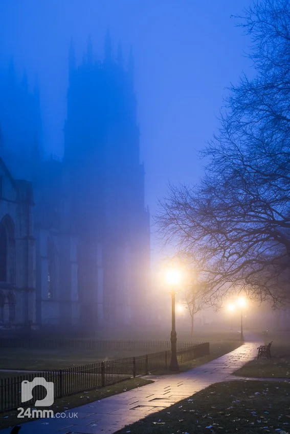 Some great, atmospheric mist had shrowded York for most of the day. At dusk the blue-ing of the sky contrasted nicely with the warm glow from the street lamps resulting a lovely colour contrast. The gentleman was photographing a roman column but I liked how it made him look like he had missed the star attraction of York Minster behind him.